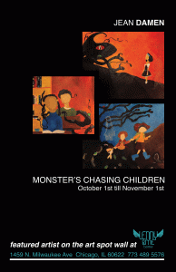 Creating this series has been amazing. It started with two paintings inspired by my daughter and a Hollis Sigler exhibition I saw earlier in the year at the Culture Center. So many people kept telling me that I should paint more so I did. If you didn’t have the chance to see MONSTERS CHASING CHILDREN in the last exhibits you can stop by Lenny and Me Home Store on 1459 N Milwaukee Ave until Nov. 1st